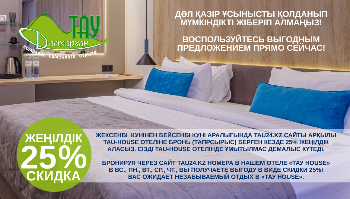 Будни со скидкой! 25% скидка на проживание с воскресенья по четверг. Действует с 7 сентября по 30 ноября 2025 года. Вас ожидает незабываемый отдых в «ТАУ House».